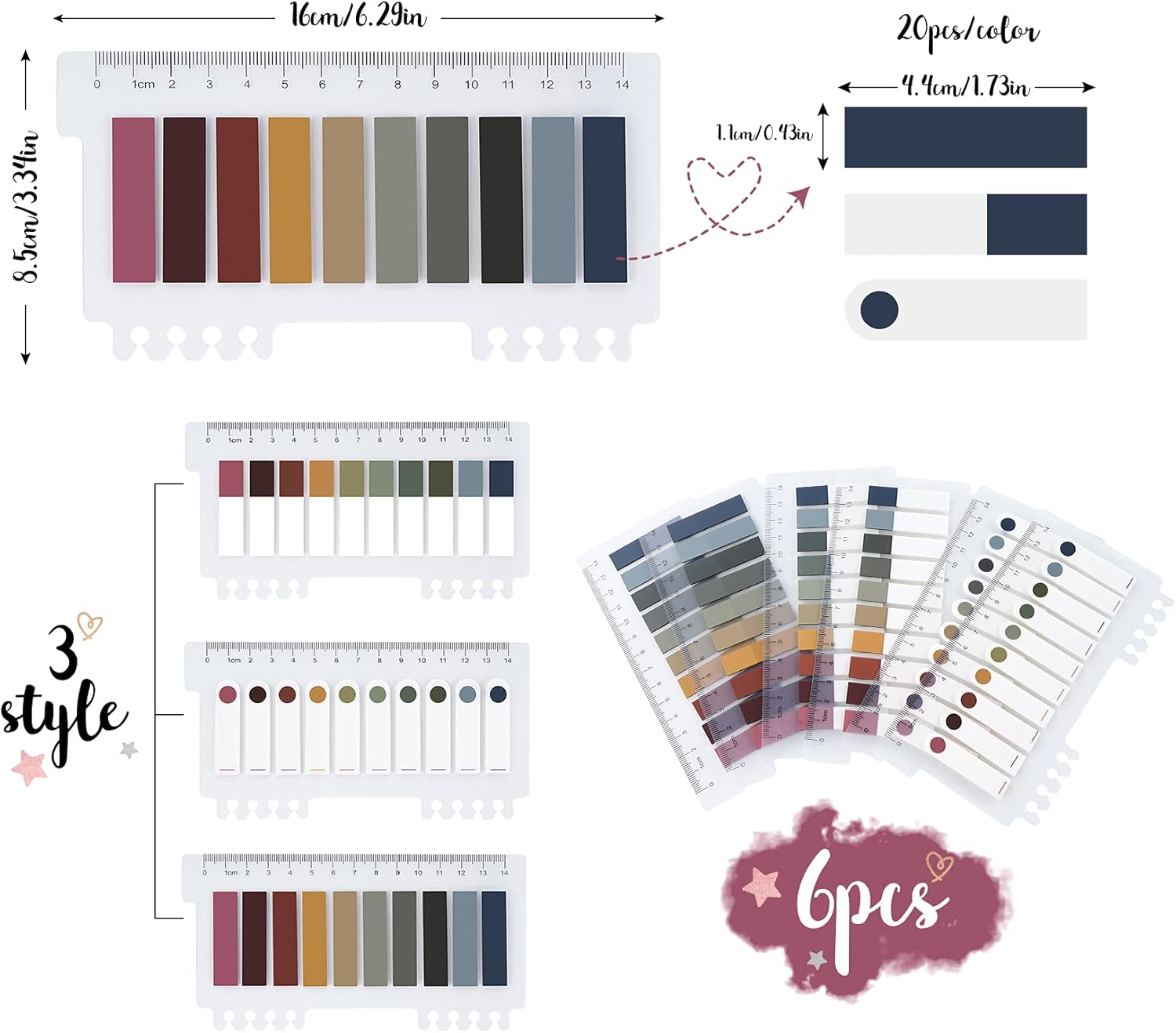 - 【BEAUTIFUL AND IMPRESSIVE BOOK TABS】This package includes 6 set sticky tabs for notebooks with ruler,1200 pieces morandi tabs for annotating books in total,0.43 inch planner tabs.These 10 colours book accessories tabs will be a sweet gift,also will be welcomed with students,office workers,teachers, families,colleagues and so on.
