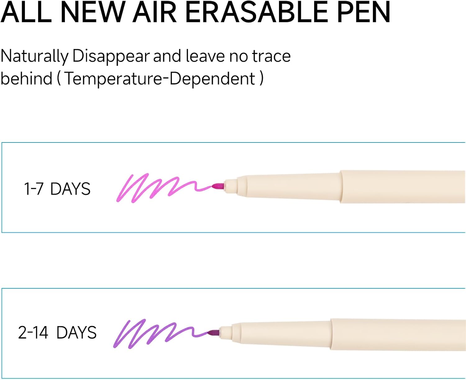 - Longer Disappearing Ink: Ink naturally fades within 2-14 days, with the speed of disappearance dependent on ambient temperature.