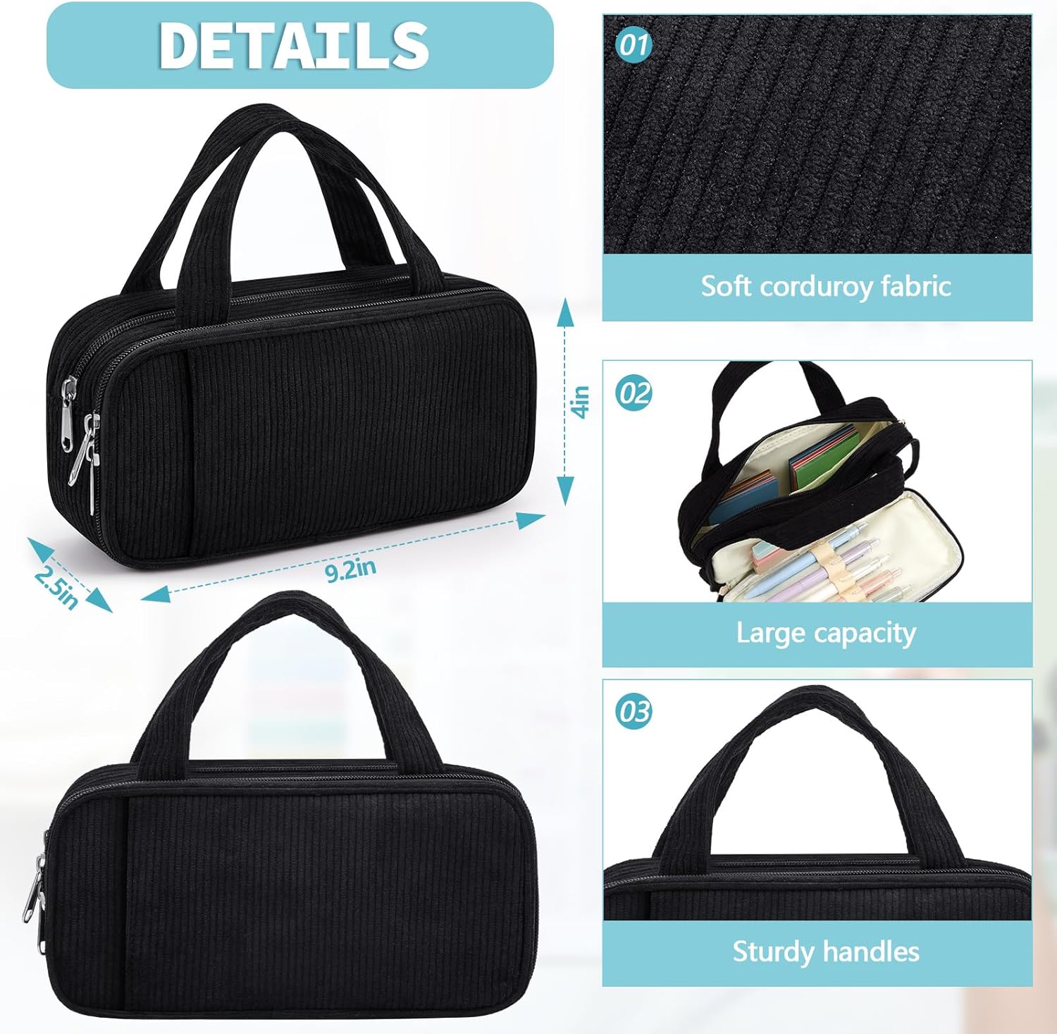 - Large Capability: black pencil pouch with hand carry measures about 9.2 x 4 x 2.5 inches, with sufficient space for you to store various stationery, like pens, marker pens, rulers, eraser, pencils and more; Cute pencil bag can be folded, compact and convenient to store and carry around