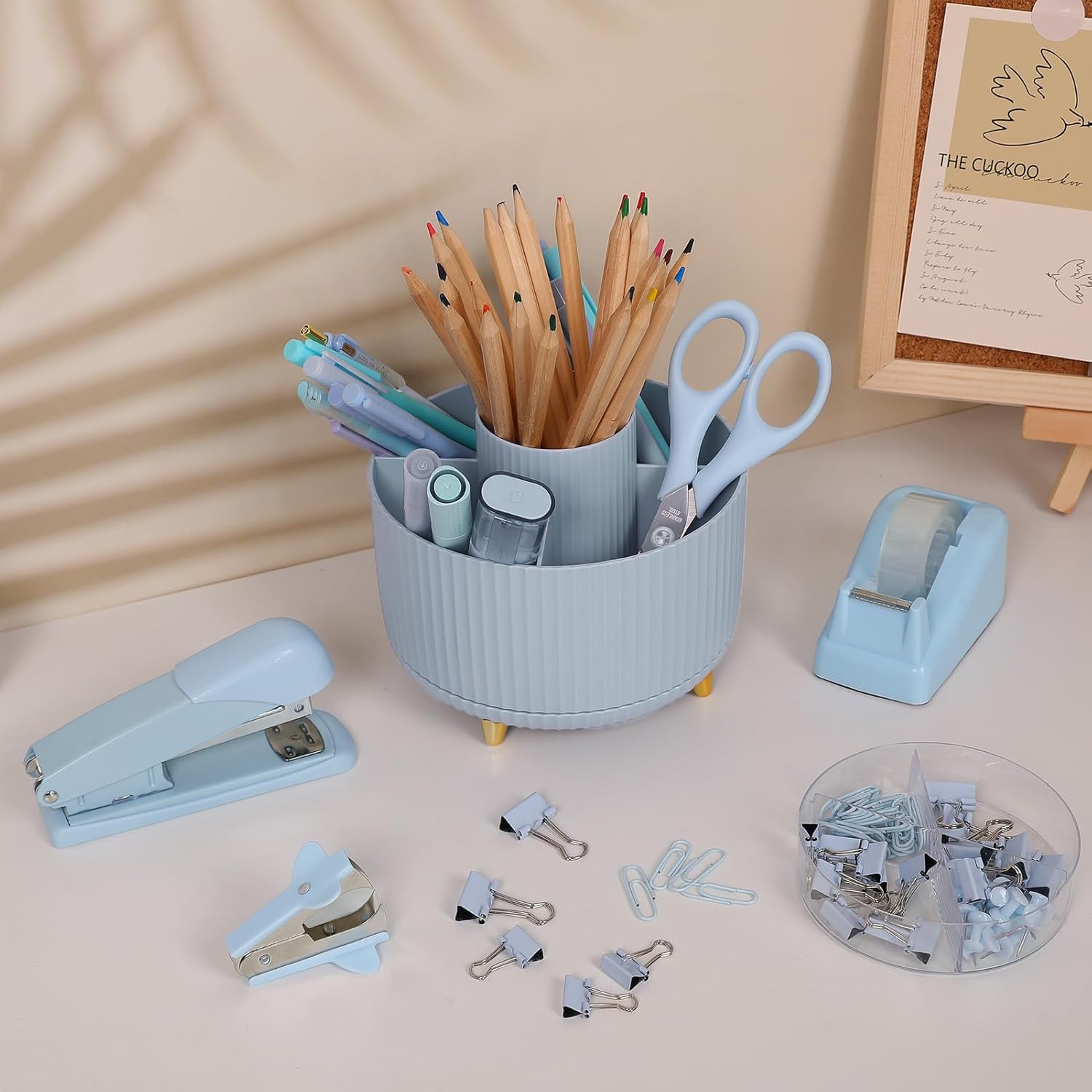 SKYDUE Desk Organizers and Accessories 10Pcs, 360-Degree Rotating Pen Holder, Stapler, Staple Remover, Tape Dispenser,2pcs Tape Refills, Binder Paper Clips Kit, Scissor (Blue)
