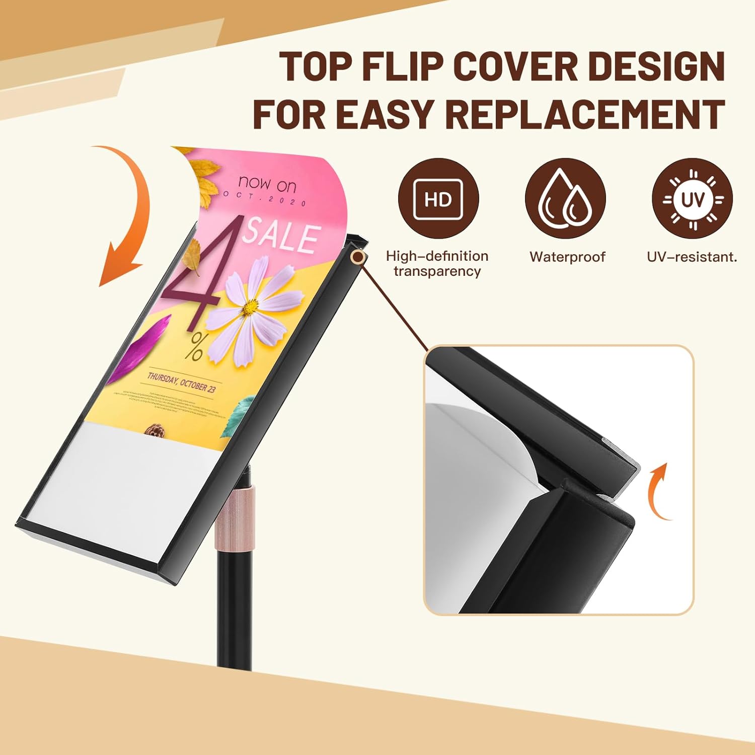 - 【Easy poster replacement and Versatile applications】Easily replace poster content with no tools needed—just flip open the top cover for quick updates. This sign stand for display is ideal for a variety of settings, including exhibition halls, restaurants, offices, schools, and stores. Perfect for store signs displays and versatile sign holders, it offers a convenient solution for showcasing messages in any environment.