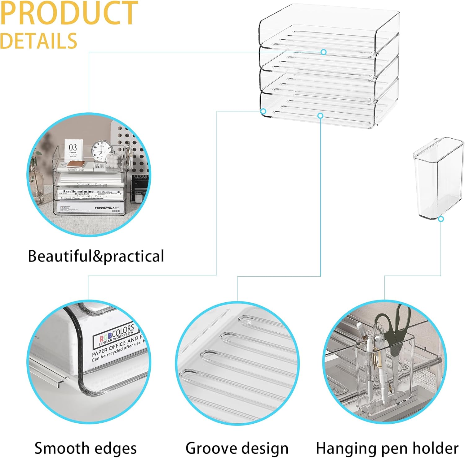 - ăAll-in-One Desk Organization ăThis 4-tier paper tray organizer for desk combines stackable paper trays and a detachable hanging pen cup (exclusive design!), keeping your files, documents, and pens neatly sorted without cluttering your workspace.
