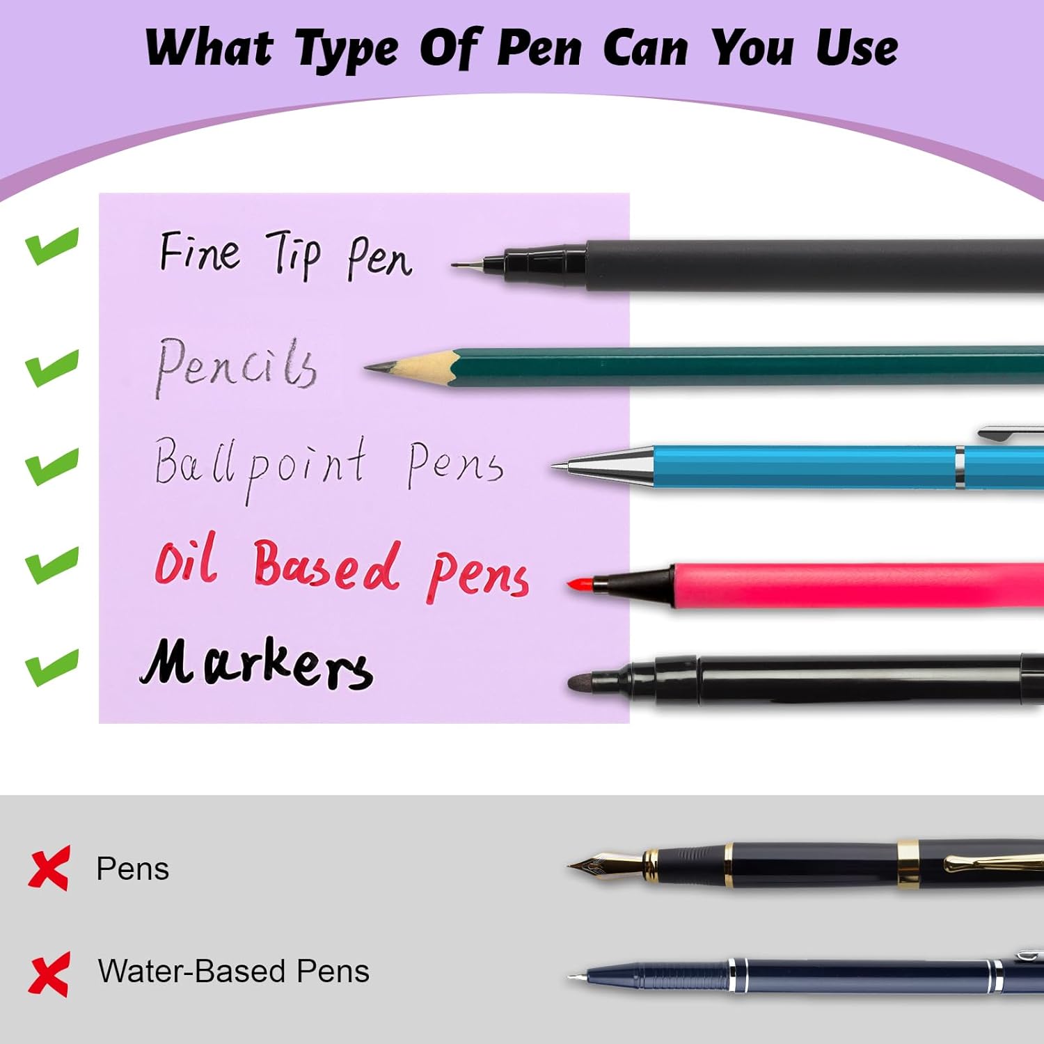 - FRIENDLY HELPFUL HINTS: To enhance your user experience, we recommend using pencils, ballpoint pens, or oil-based markers. We do not recommend using water-based pens, gel pens, or common markers unless you are willing to wait for the handwriting to dry after using a water-based pen. Please avoid wiping the handwriting immediately