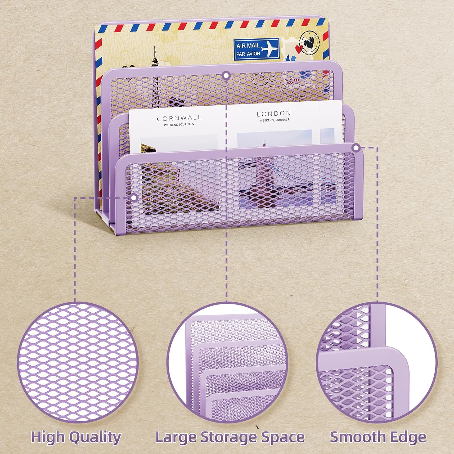 Marbrasse Mail Organizer for Desk, 3-Slot Mesh Metal Mail Holder countertop, Letter Holder, Office Desktop Envelope and Document Storage Rack (Purple)