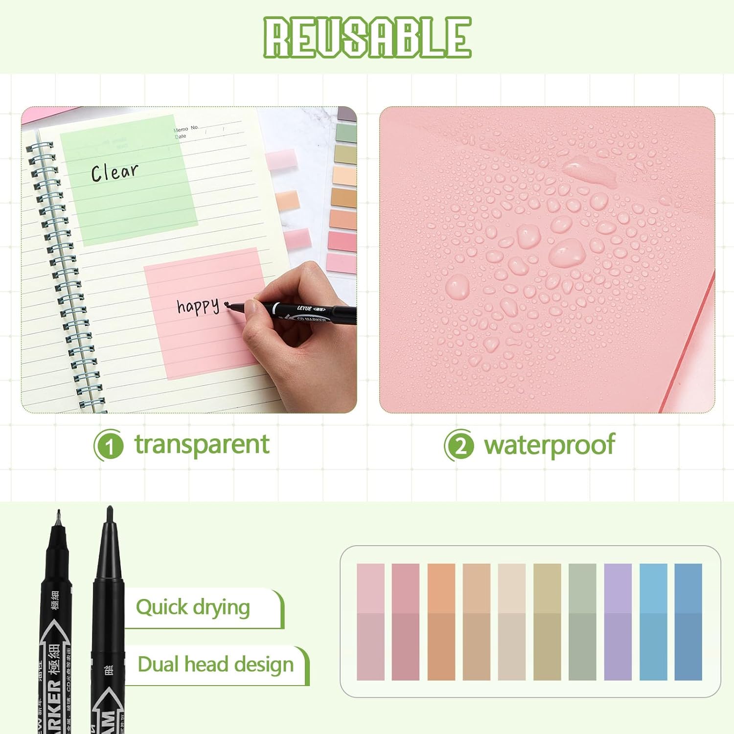 - PET Material: pastel colored transparent sticky notes and index tabs adopt quality PET material, waterproof, durable, colorfast, hard to tear, colorful and transparent design makes a translucent look, not hiding your notes, practical and decorative. The annotation sticky notes will not leave any residue on the page, you can be written on the information and paste it wherever you want