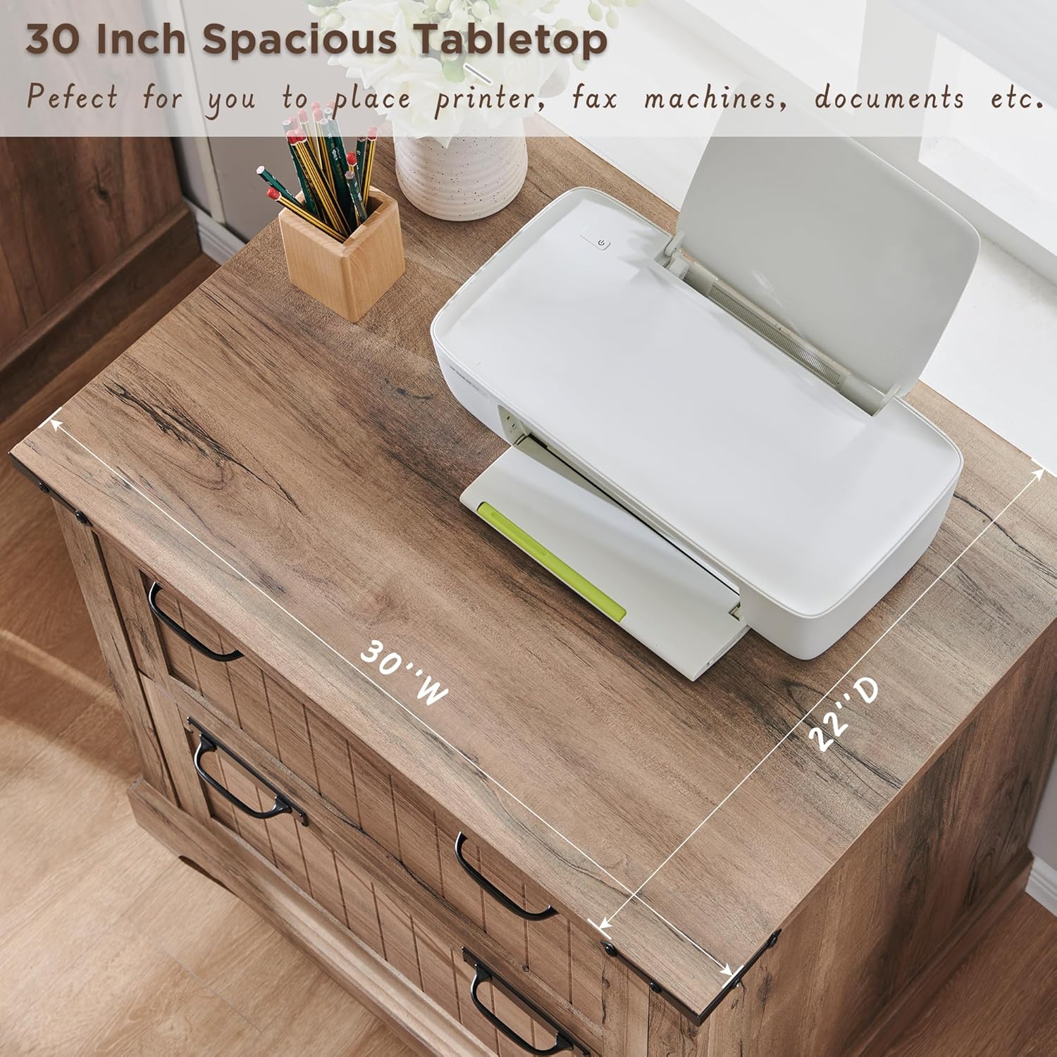 - 30 Inch Spacious Desktop:This office filing cabinet is a powerful assistant for your efficient work. 30 inches spacious desktop has a rustic finish with a delicate touch, being stain-resistant and easy to clean. No matter if you use it intensively for a long time or accidentally cause bumps or water spills, it will always remain aesthetically pleasing and practical.