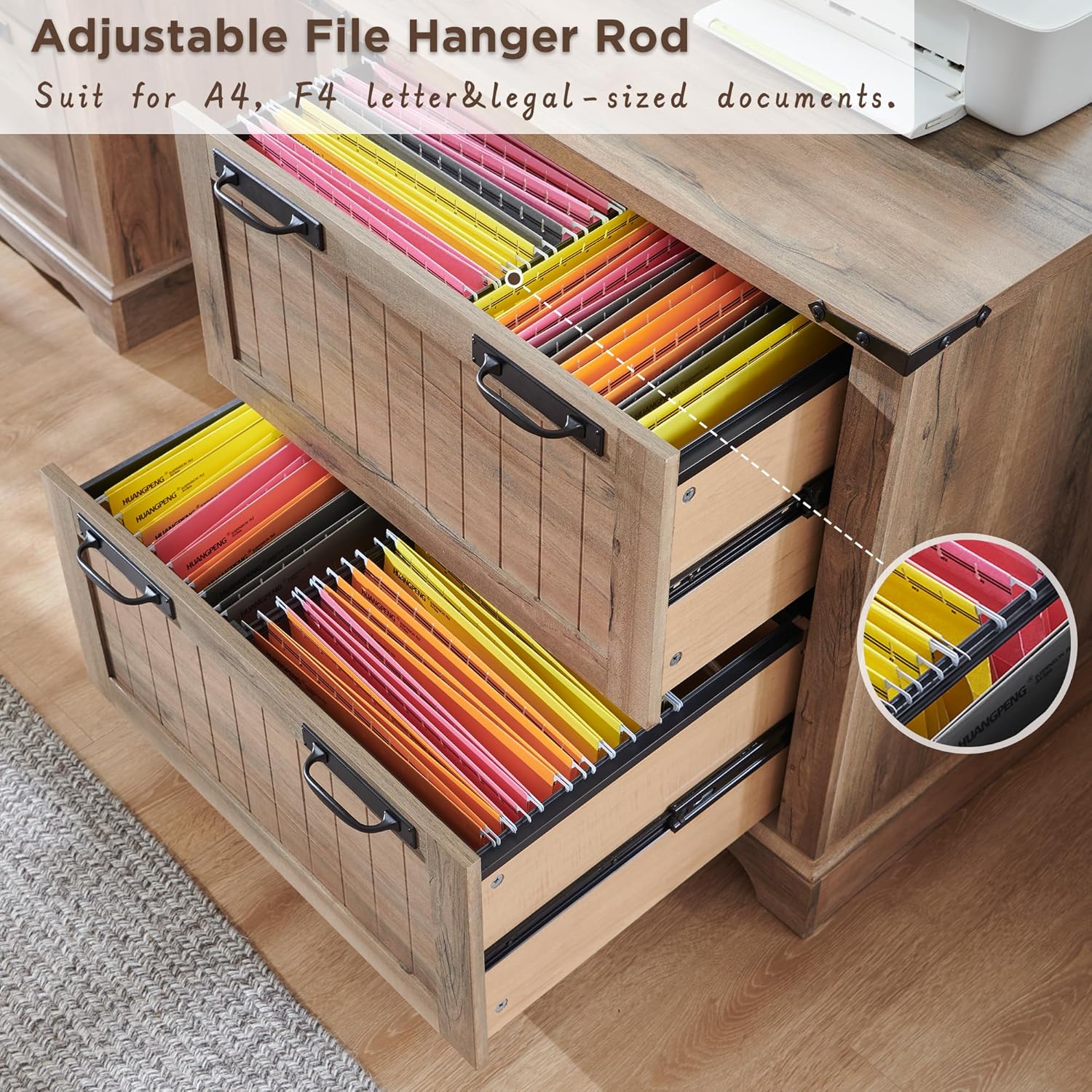 - Large Capacity Storage: Feature with 2 large drawers and possesses a vast interior space, which can effortlessly accommodate a large number of files, folders, and various office supplies. The file hanger rod design and reasonable zoning facilitate the classified storage of different types of files and improve the storage efficiency.