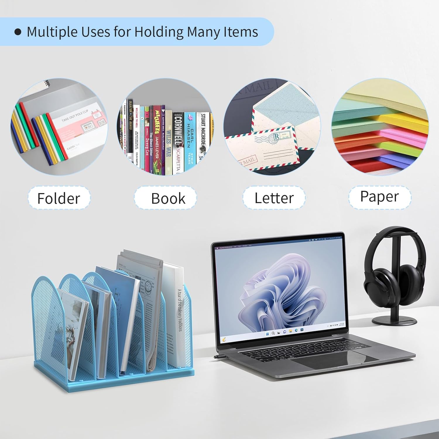 5-Section Vertical Desktop Organizer, 5-Section Mesh File Folder Stand Sorter for Office Home Classroom Organization (1, Blue)