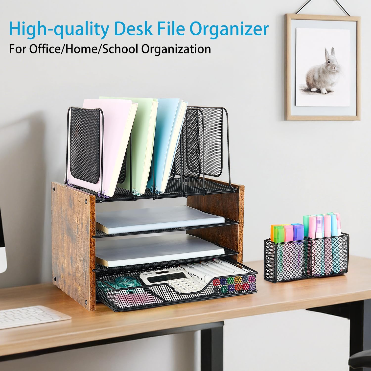 Wood Desk Organizers and Accessories, 4-Tier Workspace Desktop Paper Organizer with Drawer, 5 Vertical File Holders and Pen Holder for Office Supplies