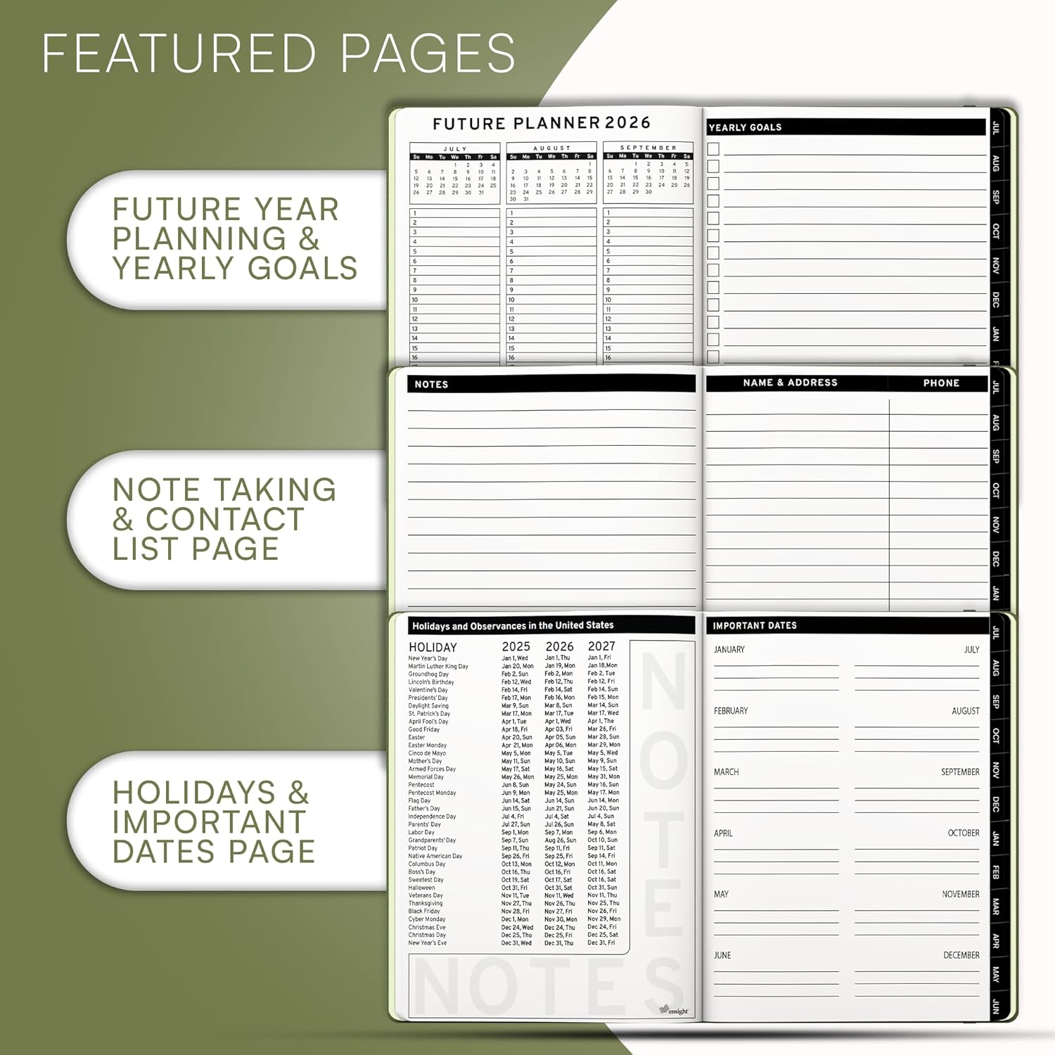 Ensight 2025-2026 HARDCOVER Leather Planner Weekly & Monthly - 6.5x8.5 Inches - Academic Planner Business Personal or Student - Pen Holder, Thick Paper, July 2025 - June 2026 (Olive Green)