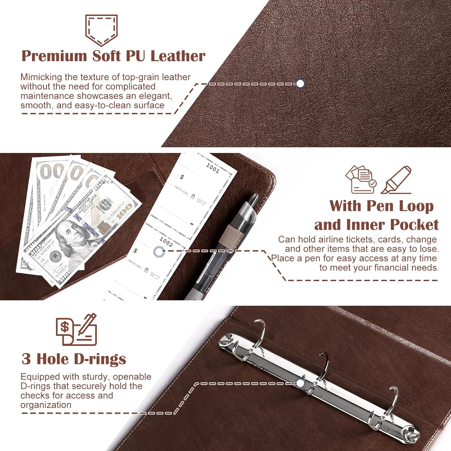 - Fashionable Hues:3 Rings check binder for end-stub deskbook checks utilizing distinctive dark brown as the primary color, this hue exudes a sense of understated elegance. Coupled with a high-quality PU material exterior, the delicate texture of the leather complements the grace of dark brown, adding a unique touch of confidence and charm to your presence in various business settings.