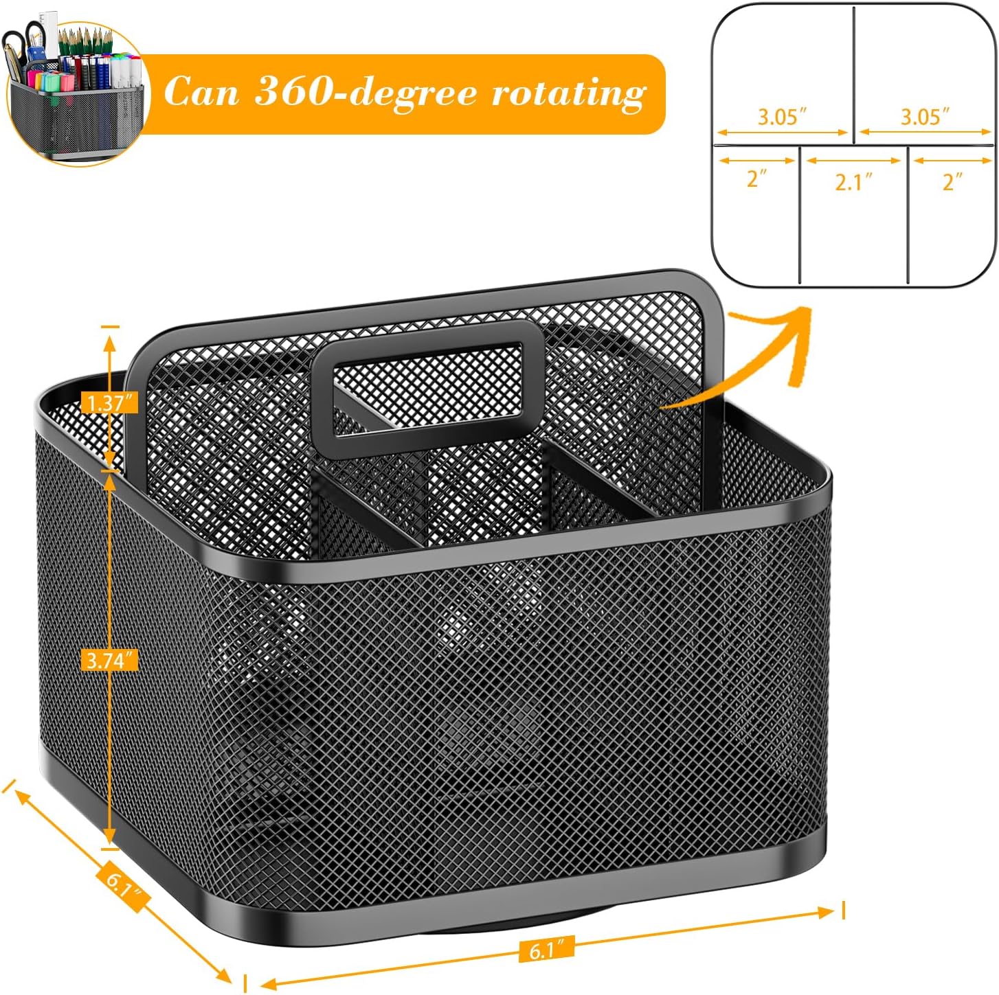 - 5 Compartments Design-The design of 5 large capacity individual compartments can be reasonably divided into storage areas. This rotating pencil holder organizer can be placed anywhere in the office, vanity, bathroom, bedroom, and living room