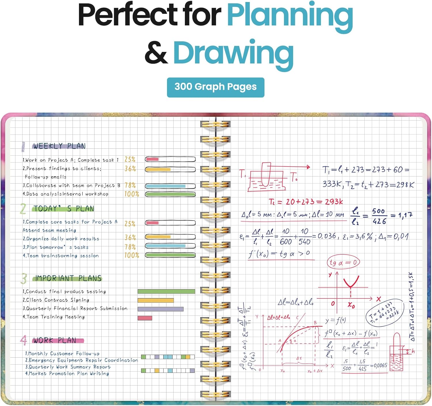 Spiral Graph Paper Notebook Journal for Work, 300 Pages, Thick B5 (7.1"x10") Grid Journals for Women & Writing, Hardcover Notebook for Note Taking, Perfect for Work School Note Taking Business, Color Splash