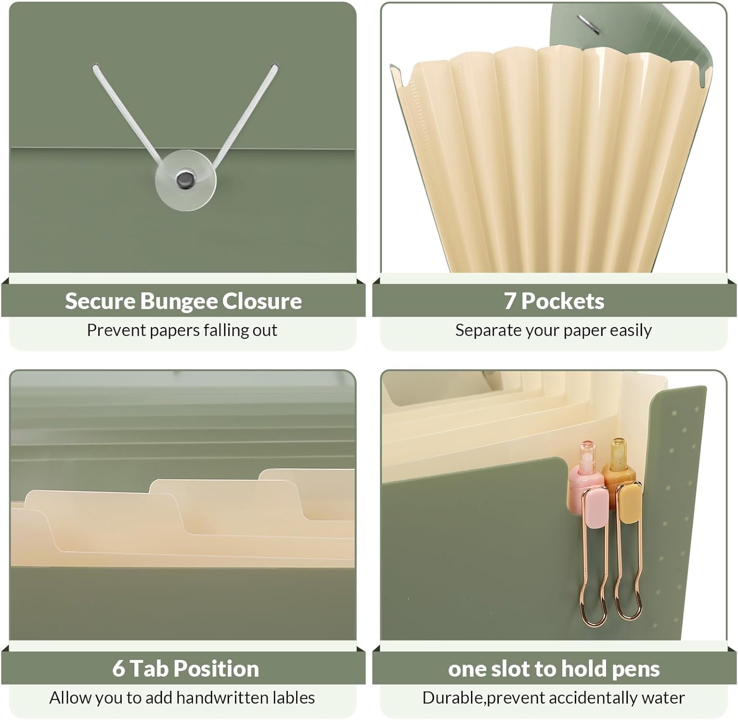 SKYDUE Accordion File Organizer, Expanding File Folder with 7 Pockets, Portable Receipt Paper Bill Document Organizer, Letter/A4 Size Filing Folder School Office Supplies, MossGreen