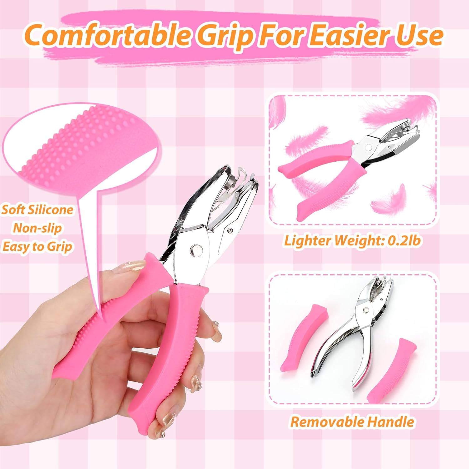 - 🔹 【Ergonomic Soft-Grip Handles for Zero Strain】 The silicone-coated handles with textured grip mold to your palm, making hole-punching feel like squeezing a stress ball. Punch through 14 sheets of paper effortlessly – no sore hands even after crafting all day!