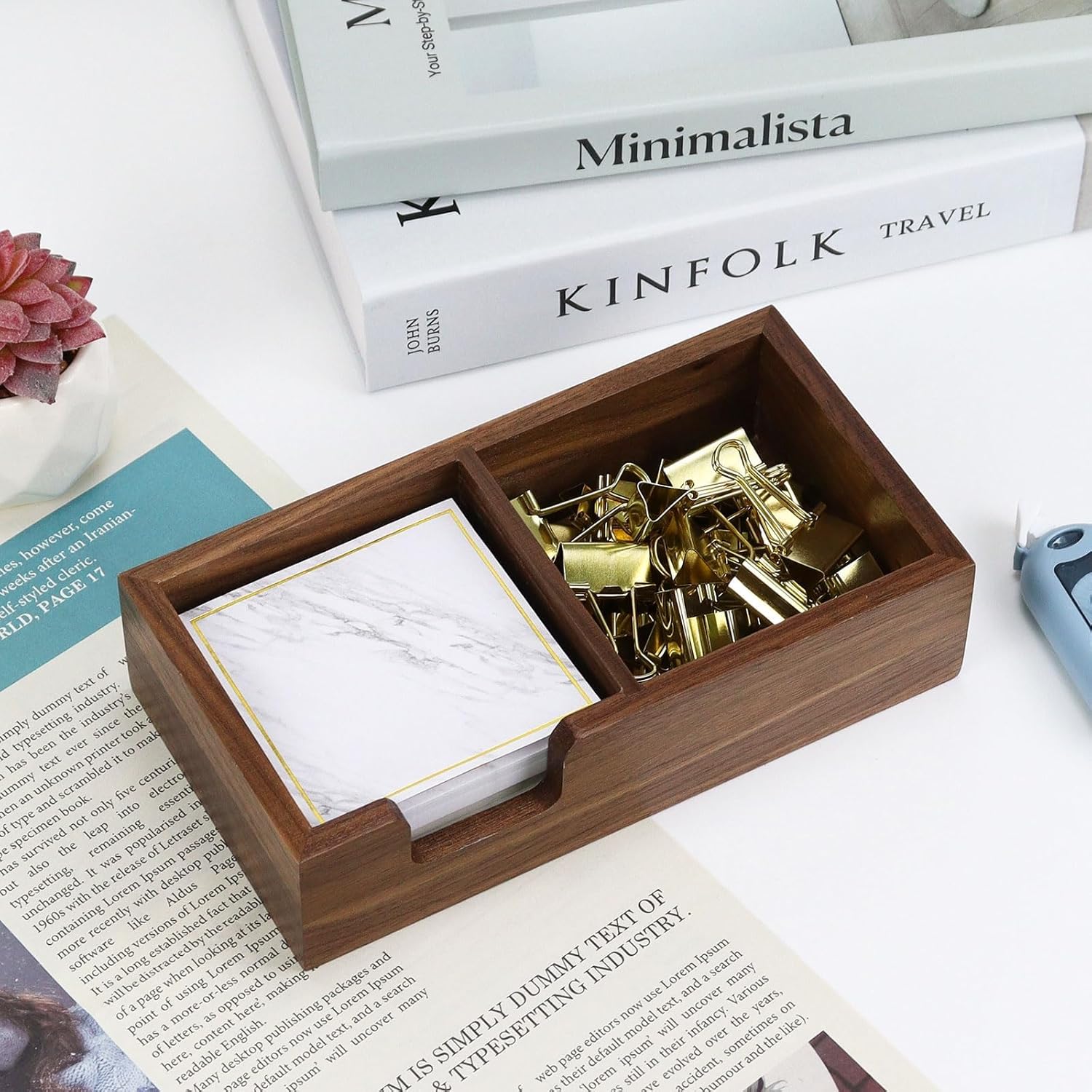 MultiBey Walnut Sticky Note Holder for Desk - 2-in-1 Organizer with Paper Clip Tray & 3x3 Post It Dispenser, Wood Self Stick Memo Pad Holder Dispenser Supplies Organizer for Office Home Schools