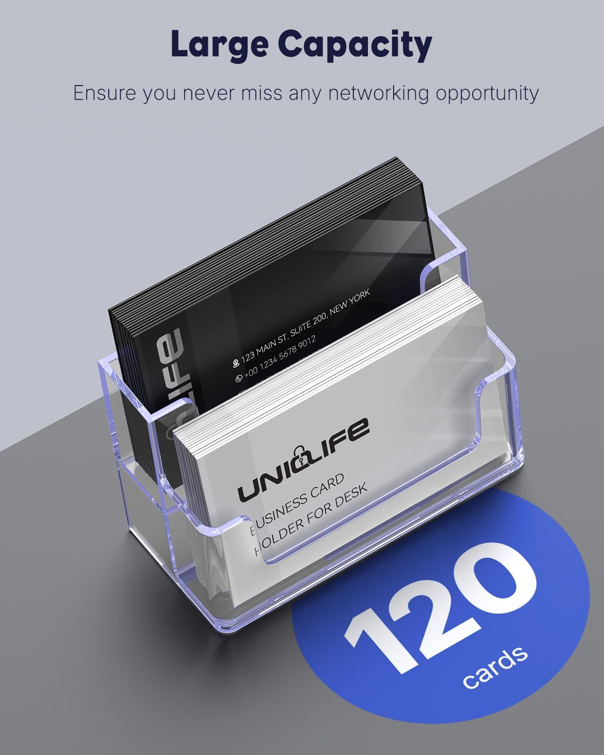 - Large Capacity: Size: 3.9" L x 1.9" W x 2.2" H. With 2 generous slots, each card stand accommodates up to 120 standard business cards. (NOTE: Capacity varies with card thickness.) Never miss a networking opportunity with ample card storage