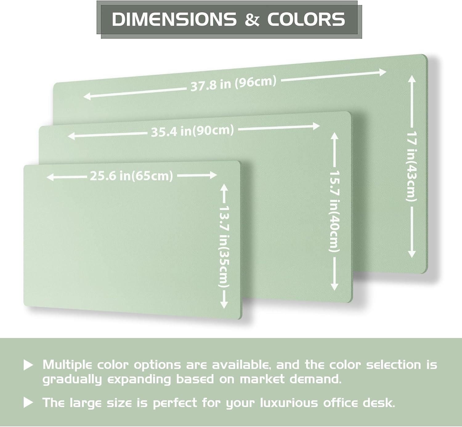 - Variety of Colors and Sizes: Available in a range of colors and sizes, our desk pad can seamlessly blend into diverse office and home environments, catering to individual needs and preferences. Size of 25.6"x13.7", 35.4"x15.7", 37.8"x17", thickness 0.08 inches, thick enough to provide soft and elastic touching; large enough to accommodate your laptop, mouse, keyboard and journal