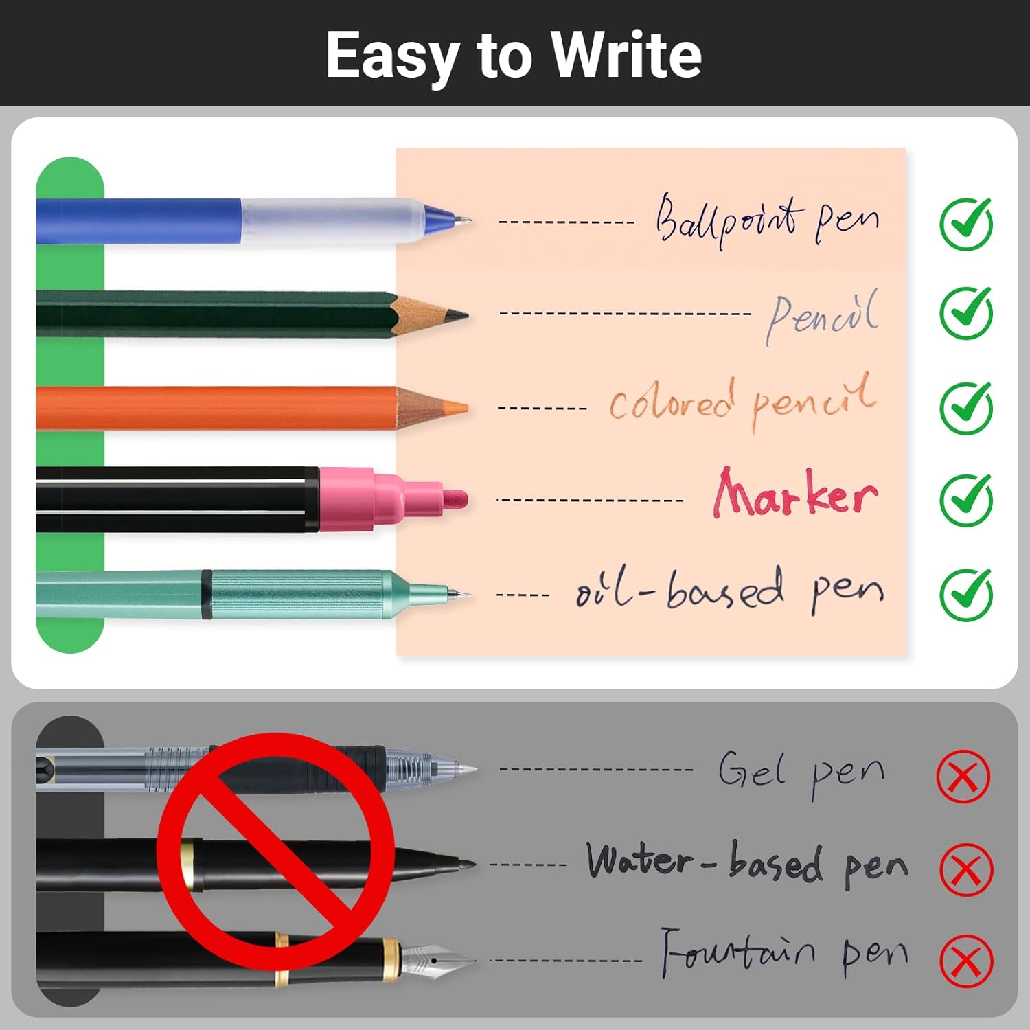 - 【Use/Avoid】These sticky notes work well with pencils, colored pencils, ballpoint pens, oil-based pens, and markers. However, gel pens, water-based pens, and fountain pens are not recommended for use on them.
