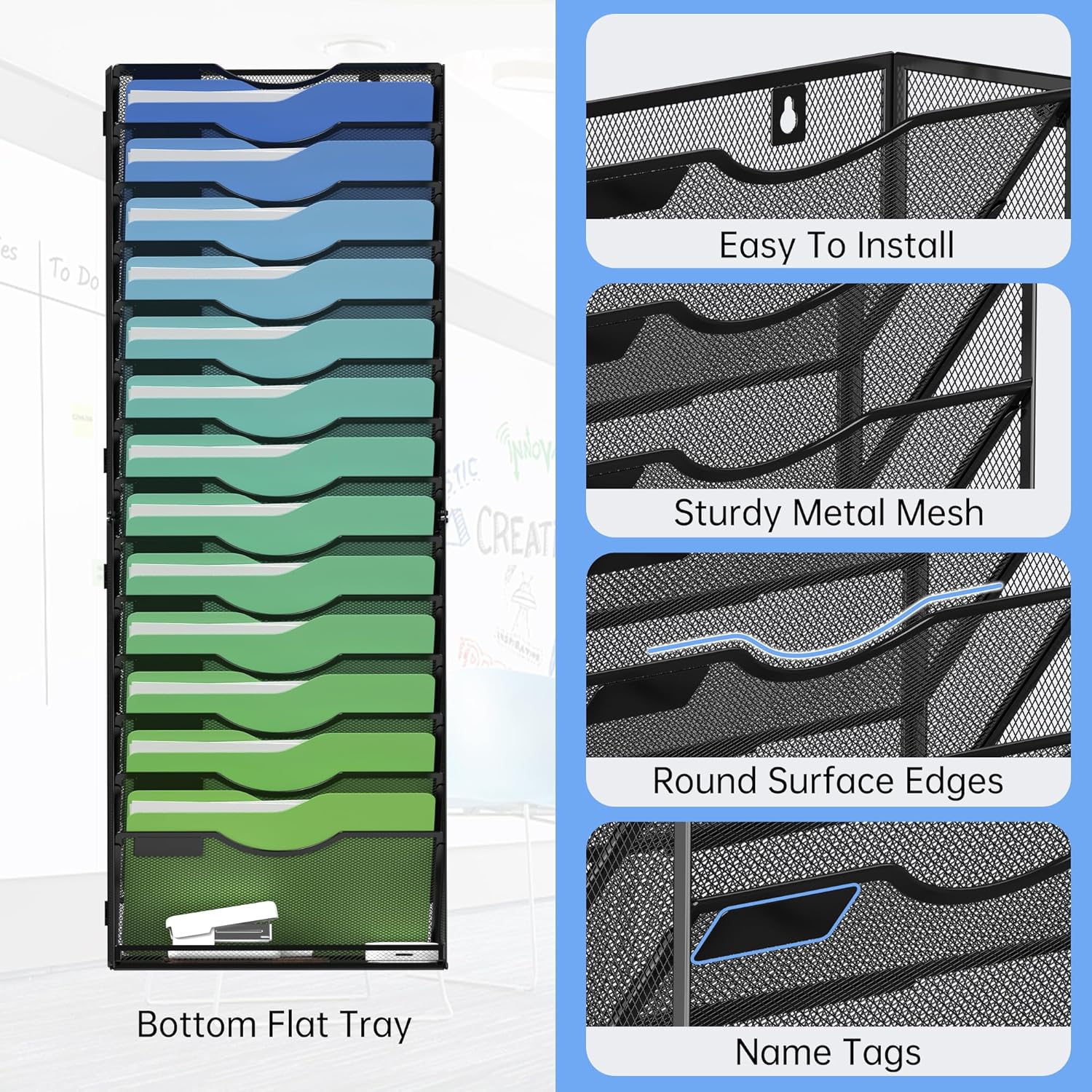- Wall file holder organizer is made of high-quality metal materials, and has a strong metal construction and durable powder coat finish