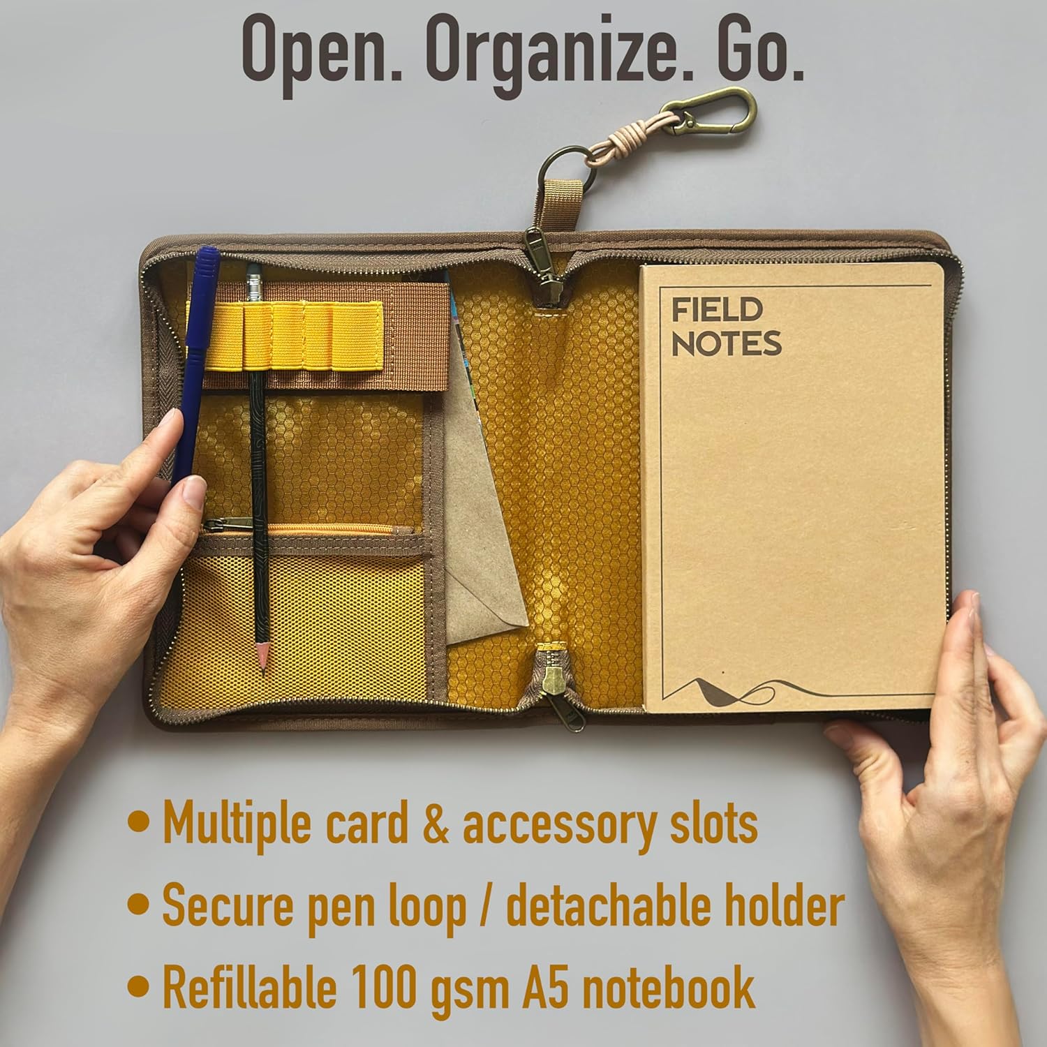 - Organizer with Pockets & Pen Loop – Internal pockets and a pen holder keep all your essentials organized, making it a complete tactical notebook cover and planner organizer for travel or daily use.